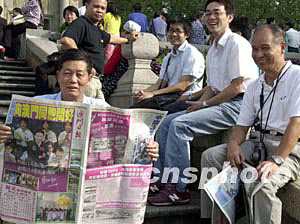 中國首飛航天員楊利偉及載人航天飛行代表團到澳門訪問,引起澳門廣大市民的極大興趣,六日上午在大三巴牌坊前,許多市民爭相閱讀有關(guān)新聞。中新社記者:李剛
