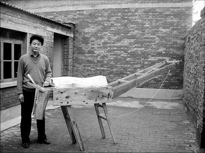 今年31歲的梁國君酷愛《三國演義》、《紅樓夢》、《孫子兵法》等古典著作,尤其對書中涉及的一些古代工藝頗感興趣。去年12月,梁國君觀看央視《科學(xué)歷程》節(jié)目,得知木牛流馬引起很多人的興趣,但苦于沒人能夠破解其原理并制造出來,讓大家一睹真容。有專家認為木牛流馬可能就是北方的獨輪推車。木牛流馬之謎激起梁國君的好奇心。他認真琢磨,猛然意識到木牛流馬之所以能夠運動,可能依據(jù)的是杠桿原理。他立即用硬紙片和釘子做了一只木牛的模型,用手一抬一推,模型果然向前移動,梁國君心里豁然開朗。從此以后,梁國君就利用節(jié)假日,按照《三國演義》中所說的尺寸買來木頭,自己關(guān)在房間里叮叮當(dāng)當(dāng)?shù)毓膿v起來。