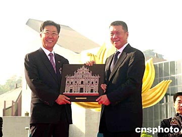 澳門特區(qū)行政長官何厚鏵在儀式上向胡世祥贈送紀念品。中新社記者:李剛