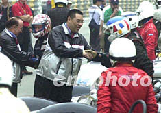第五十屆澳門格蘭披治大賽車九日進(jìn)行正式比賽,澳門社會文化司司長崔世安等賽前與參賽車手握手,鼓勵(lì)他們賽出好成績。中新社記者:李剛