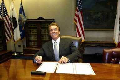 阿諾·施瓦辛格于美國(guó)當(dāng)?shù)貢r(shí)間11月17日宣誓就任加利福尼亞州第38任州長(zhǎng)。施瓦辛格宣誓就職儀式吸引了大約740名記者參加,規(guī)?氨让绹(guó)總統(tǒng)就職儀式,世界各地?cái)?shù)百萬(wàn)觀眾觀看了儀式的現(xiàn)場(chǎng)直播。圖為施瓦辛格新官上任首日喜簽首個(gè)州長(zhǎng)令。
