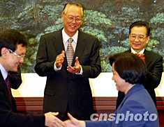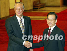 中國國務(wù)院總理溫家寶十八日在北京會見新加坡總理吳作棟。中新社記者:鄭萍萍
