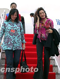 剛走下舷梯的世界小姐機構(gòu)主席朱莉婭·莫莉(左)與二00二年世界小姐阿金 (右)。關(guān)向東 攝