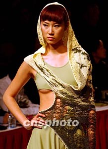 十一月二十五日在北京舉行的“杉杉杯”中國時(shí)裝設(shè)計(jì)新人獎(jiǎng)評(píng)選中,多位來自大學(xué)的年青新秀展示反戰(zhàn)主題時(shí)裝,用軍綠色搭配戰(zhàn)爭生活的混亂。中新社記者:賈國榮