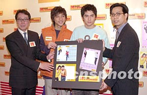 樂(lè)壇組合Shine成員黃又南、徐天佑12月2日在香港出席《Kodak數(shù)碼沖曬多面睇》記者會(huì),Kodak更設(shè)計(jì)了一套三款的「Kodak ×Shine 2004慈善相片年歷」予香港世界宣明會(huì)作慈善用途。中新社記者:鄧慶樂(lè)