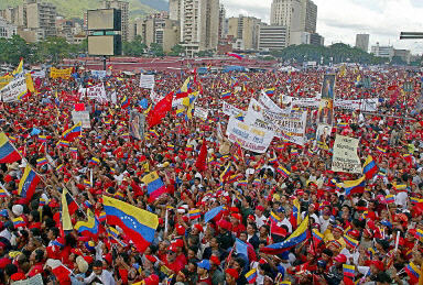 委內(nèi)瑞拉數(shù)十萬擁護(hù)查韋斯的民眾6日在首都加拉加斯舉行大規(guī)模游行,慶祝查韋斯選舉獲勝5周年。