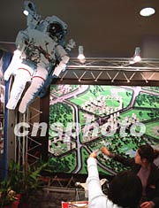 十二月中旬正在北京舉行的冬季房展會(huì)上,一家房地產(chǎn)開(kāi)發(fā)商請(qǐng)來(lái)“太空人”模型為樓盤促銷。作者:張雷