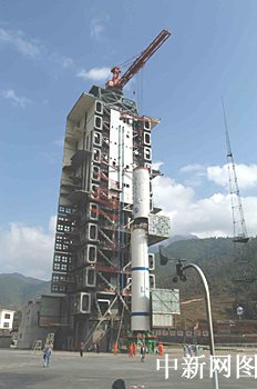 圖:"長征二號丙"改進型運載火箭一、二級吊裝上發(fā)射塔架