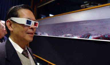 1月5日,在美國加利福尼亞州帕薩迪納的宇航局噴氣推進(jìn)實(shí)驗(yàn)室,彼特博士配戴著立體眼鏡觀看“勇氣”號(hào)火星探測(cè)器搭載的照相機(jī)拍攝的三維圖像。