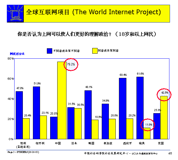 只有美國和中國的網民例外,中國的被訪網民中認為網絡可以幫助人們更好地理解政治的人超過了三分之二。和前面的問題一樣,這一結論與兩年前的調查結果完全符合。
