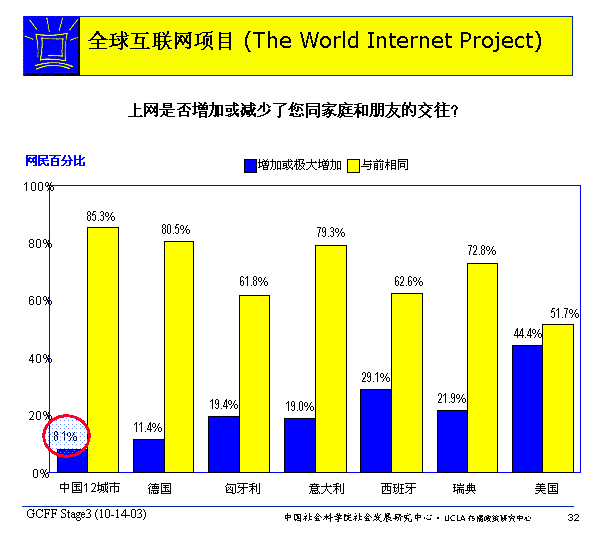 中國只有少量被訪網(wǎng)民認為上網(wǎng)增加了他們同家庭和朋友之間的交往,很可能是因為中國人更加看重親友之間面對面的直接交往。