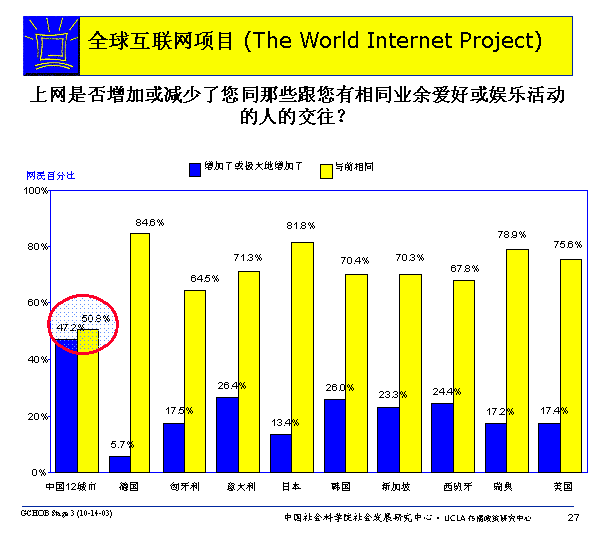 然而,還是有相當(dāng)數(shù)量的網(wǎng)民認為使用互聯(lián)網(wǎng)增加了他們同跟他們有相同業(yè)余愛好或相同娛樂活動的人的交往;這樣的網(wǎng)民在中國最多,47.2%被調(diào)查的中國互聯(lián)網(wǎng)網(wǎng)民認為互聯(lián)網(wǎng)增加了增加或極大的增加了交往。