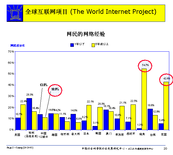 美國和瑞典有相當高比例的網齡較長網民(42.8%的美國網民和54.6%的瑞典網民有長達5年或更長網齡)