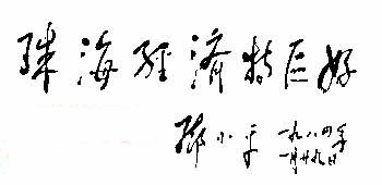午飯前,小平同志與澳門知名人士馬萬祺及珠海的領(lǐng)導(dǎo)坐在珠海賓館翠城餐廳休息。珠海賓館總經(jīng)理張倩玲想在餐廳中間擺張桌子,請小平同志題詞。李天增對她說,小平同志在深圳也沒有題,現(xiàn)在也不一定會題,還是把桌子擺邊上一點。說完李天增便忙著排座位,回頭一看,鄧小平已主動走過去,伏案揮毫,不暇思索地寫下“珠海經(jīng)濟特區(qū)好”。