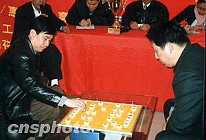 二月五日元宵佳節(jié),柳大華(右)、呂欽(左)兩位中國象棋特級國際大師在廣東惠州市為當?shù)氐南笃鍚酆谜哌M行了精彩表演賽。作者:宋秀杰