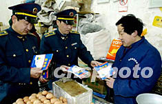 二月六日,北京東城工商分局工作人員為轄區(qū)十個(gè)集貿(mào)市場出售禽類產(chǎn)品的商戶送去新出版的預(yù)防“禽流感”的書籍。作者:羅偉