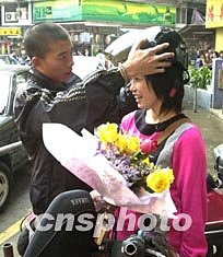 十四日下午,在澳門三盞燈一花店的街邊,一對青年購買情人節(jié)玫瑰后,男青年殷勤地將頭盔幫女友戴在頭上。情人節(jié)已成為許多愛侶們共渡甜蜜、溫馨浪漫的重要節(jié)日。作者:李剛