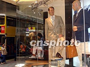 三月九日,在香港舉行的意大利著名男裝品牌ERMEGILdO ZEGNA旗艦店開幕儀式上,模特在商店櫥窗里展示新款服飾。中新社記者:錢興強