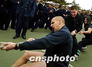 圖:參加中法青島軍事演習(xí)官兵舉行拔河比賽
