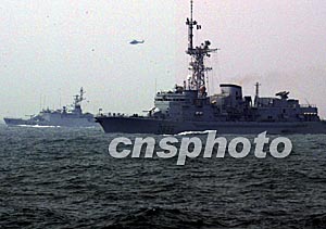 三月十六日,中法聯(lián)合軍事演習在青島某海域進行,中法海軍協(xié)作配合戰(zhàn)術演練。中新社記者:宋吉河