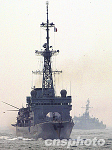 中法聯(lián)合軍事演習三月十六日在青島某海域進行。中法艦艇進行編隊戰(zhàn)術演練。中新社記者:宋吉河