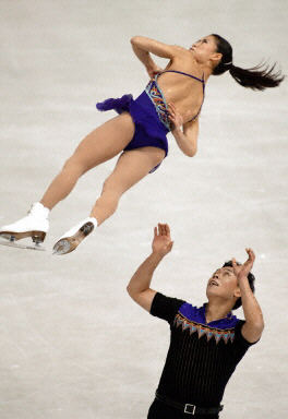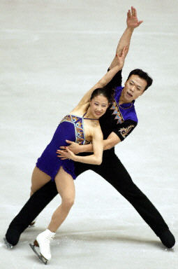3月22日,2004世界花樣滑冰錦標賽在德國多特蒙德市開幕,中國著名花樣滑冰選手申雪/趙宏博在雙人滑短節(jié)目比賽中排名第四,衛(wèi)冕難度增大。圖為申雪/趙宏博在短節(jié)目比賽中。