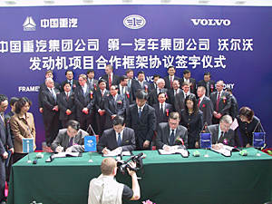 中新網(wǎng)北京3月29日電(通訊員郭化南 記者王魯平)在中國國內(nèi)重型卡車市場占有重要地位的中國重型汽車集團(tuán)有限公司和中國第一汽車集團(tuán)公司,今天在北京釣魚臺(tái)國賓館與世界發(fā)動(dòng)機(jī)技術(shù)行業(yè)研究開發(fā)與生產(chǎn)制造巨頭瑞典沃爾沃集團(tuán)簽署了發(fā)動(dòng)機(jī)生產(chǎn)合作框架協(xié)議,三方將聯(lián)合打造世界一流發(fā)動(dòng)機(jī)生產(chǎn)基地。