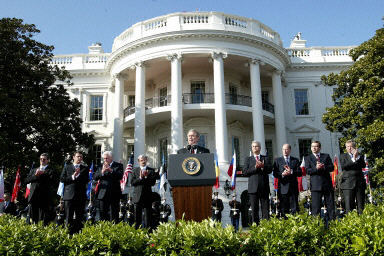 隨后,美國總統(tǒng)布什在白宮南草坪舉行儀式,歡迎七國正式加入北約。布什說,恐怖主義是北約面對的新敵人,但恐怖分子無法打破北約的團(tuán)結(jié)。他還感謝七國參與在美國為首的在阿富汗和伊拉克的軍事行動(dòng)。