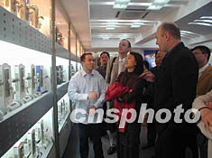由法國巴黎圣但尼省維爾塔內(nèi)市市長雅克·布萊爾先生等七人組成的“法國市長代表團(tuán)”日前在溫州市甌海區(qū)考察其民營經(jīng)濟(jì),并尋求雙方經(jīng)貿(mào)合作機會。圖為代表團(tuán)參觀中國十大鎖王之一的“天宇鎖業(yè)”。作者:林丹