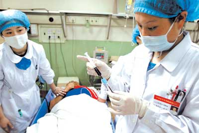 下午3時25分,307醫(yī)院急診樓外停放著兩輛999急救車,有5名工人已被送進(jìn)急診室內(nèi)。在急診大廳右側(cè)的一間急救室內(nèi),一名50多歲的老人,不停地抽搐著,病床旁放著一個裝嘔吐物的大桶,兩名比較嚴(yán)重的工人則處于昏迷狀態(tài),十幾名醫(yī)生正在進(jìn)行搶救。