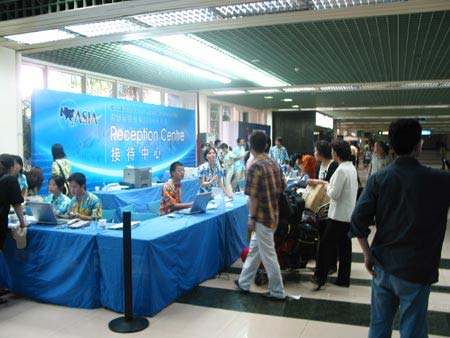 博鰲亞洲論壇2004年年會于4月24日在海南博鰲開幕。本次論壇年會主題為“亞洲尋求共嬴——一個對世界開放的亞洲”,表明2004年博鰲亞洲論壇年會將在全球背景下,探討亞洲各國和地區(qū)區(qū)域經(jīng)濟(jì)合作問題,尋求亞洲共同進(jìn)步的有效途徑。圖為忙碌的?诿捞m機(jī)場博鰲亞洲論壇年會接待處。(春風(fēng))