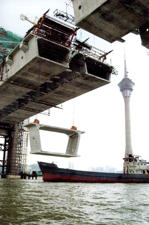 中新網(wǎng)5月12日電 據(jù)澳門日報報道,澳門第三大橋工程進展順利,預(yù)計主航道對上的橋面可在短期內(nèi)完成。
