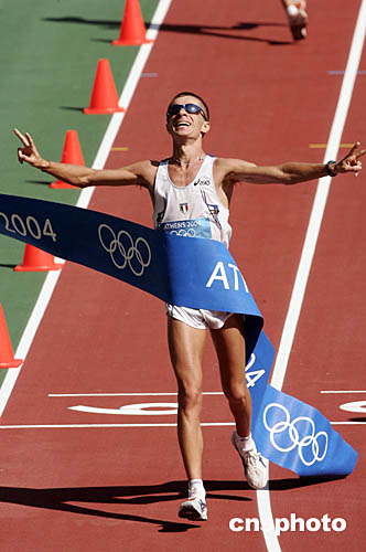 在當(dāng)?shù)貢r(shí)間8月20日舉行的男子20公里競(jìng)走比賽中,意大利選手布魯格內(nèi)蒂奪金。圖為他在沖過終點(diǎn)后歡呼的鏡頭。