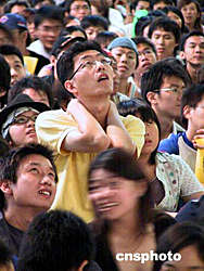 中國臺(tái)北隊(duì)在雅典奧運(yùn)會(huì)棒球賽中3:4惜敗日本隊(duì),臺(tái)北球迷為之惋惜。中新社記者:曾嘉