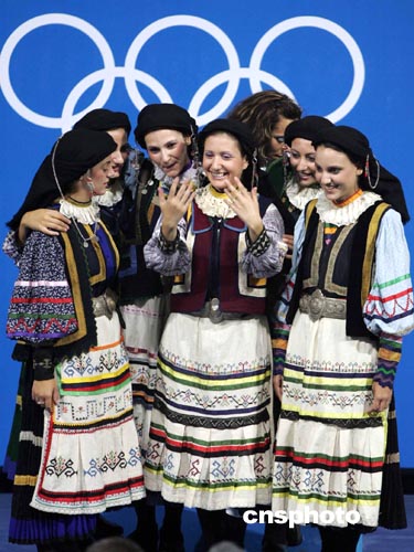 當(dāng)?shù)貢r(shí)間八月二十二日下午,雅典奧運(yùn)會(huì)射擊比賽全部結(jié)束,身著民族服裝的頒獎(jiǎng)女郎在五環(huán)前留影。中新社記者:毛建軍
