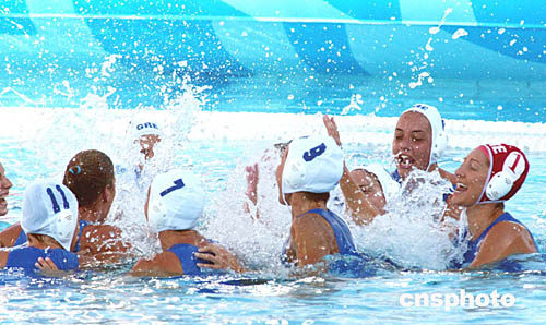 在當(dāng)?shù)貢r間8月22日舉行的女子水球賽中,希臘隊(duì)以7比4戰(zhàn)勝俄羅斯。圖為隊(duì)員們歡慶勝利的場面。
