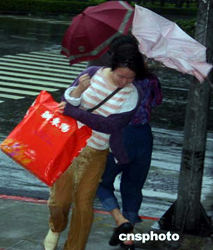 臺風“艾利”影響驚人,八月二十四日臺灣各地普降豪雨,并有險情、災情傳出。圖為臺北市風大雨大,行人雨傘翻了蓋。中新社記者:董會峰