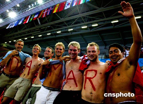 當(dāng)?shù)貢r間8月26日晚,丹麥女子手球隊以32比28戰(zhàn)勝中國隊進入四強,丹麥球迷以獨特的方式慶祝這一勝利。中新社記者:王瑤