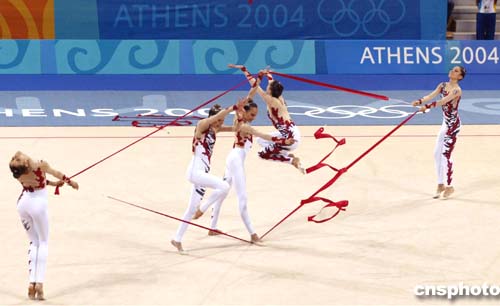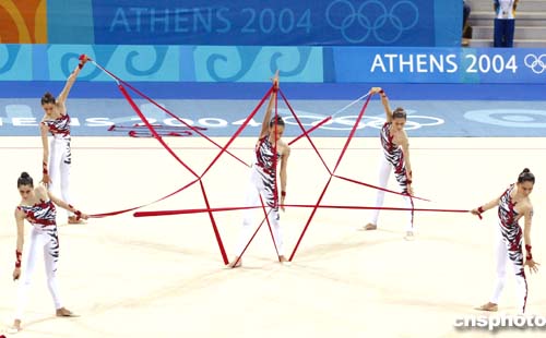 圖為意大利隊在藝術體操集體全能比賽中的精彩表現,她們獲得該項目的銀牌。