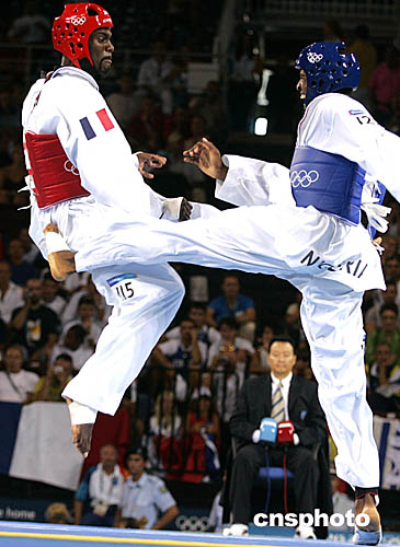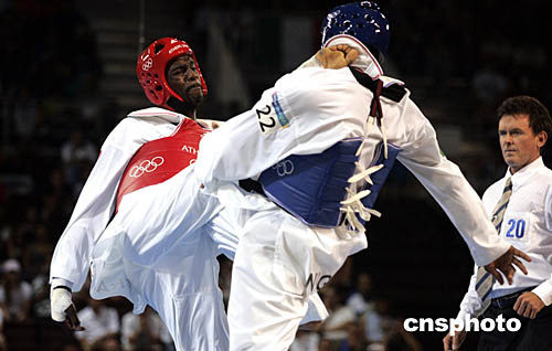 圖為尼日利亞選手Chika Chukwumerije和法國選手Pascal Gentil在男子80公斤級跆拳道比賽中,展開激烈對抗。
