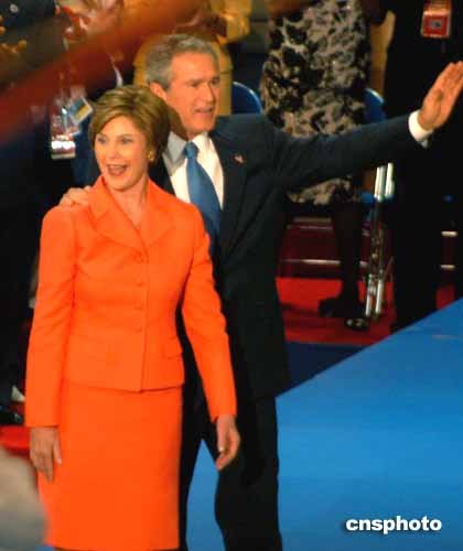 當(dāng)?shù)貢r間九月二日晚,美國總統(tǒng)布什在共和黨大會閉幕式上正式接受共和黨總統(tǒng)候選人提名后,與第一夫人勞拉以及美國副總統(tǒng)切尼夫婦一起向全場致意。作者:趙海燕