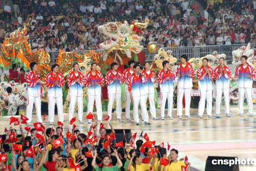| 9月7日晚上,位于快活谷的香港大球場成為名副其實(shí)的“歡樂之谷”,國家奧運(yùn)金牌選手和數(shù)萬名香港市民會(huì)聚在此,共享中國在雅典奧運(yùn)會(huì)奪金的喜悅和榮光!皧W運(yùn)精英大匯演”在這里拉開帷幕。圖為女排教練陳忠和帶領(lǐng)全體選手高歌,為晚會(huì)推向高潮。作者:洪少葵
