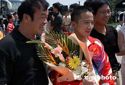 在第二十八屆雅典奧運(yùn)會(huì)上奪得六十二公斤級(jí)金牌的閩籍選手石智勇,九月十三日載譽(yù)返閩抵達(dá)福州長(zhǎng)樂(lè)國(guó)際機(jī)場(chǎng),與眾多歡迎者合影留戀。據(jù)悉,福建省政府決定授予石智勇“福建省功勛運(yùn)動(dòng)員”榮譽(yù)稱號(hào)、獎(jiǎng)勵(lì)人民幣五十萬(wàn)元。作者:劉可耕
