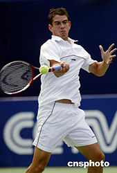 九月十三日,目標(biāo)為世界第五大網(wǎng)球賽事的中國網(wǎng)球公開賽開始在北京網(wǎng)球中心中央球場進(jìn)行男子單打正選賽的比賽,首場比賽芬蘭的涅米寧戰(zhàn)勝西班牙洛佩斯晉級。圖為西班牙選手洛佩斯在比賽中。中新社記者:盛佳鵬