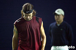 中國(guó)網(wǎng)球公開賽男單比賽九月十五日晚在北京網(wǎng)球中心中央球場(chǎng)繼續(xù)進(jìn)行,賽會(huì)頭號(hào)種子西班牙名將莫亞以零比二不敵法國(guó)選手特松加,爆出本屆中國(guó)網(wǎng)球公開賽最大冷門,無緣晉級(jí)下一輪。中新社記者:盛佳鵬