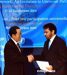 當(dāng)?shù)貢r(shí)間九月二十二日,中國(guó)常駐聯(lián)合國(guó)代表王光亞(左)在紐約聯(lián)合國(guó)總部向安南秘書(shū)長(zhǎng)的代表交存了中國(guó)加入《聯(lián)合國(guó)人員和有關(guān)人員安全公約》的加入書(shū)。三十天后,該公約將對(duì)中國(guó)生效。作者:趙海燕