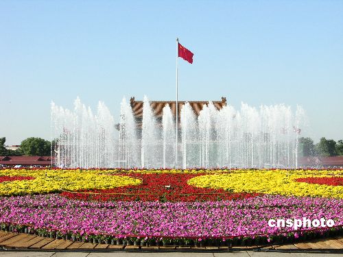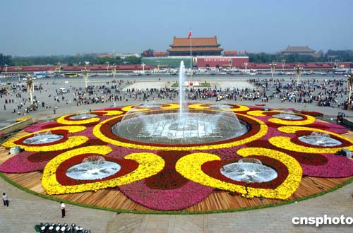 今年天安門廣場花壇布景總體格局是以“萬眾一心”主花壇為主,東西兩側(cè)分別以畫卷式花壇以及大型組字燈箱花壇構(gòu)成!叭f眾一心”主花壇直徑達72米,中心是一個直徑30米的大型噴泉。東側(cè)畫卷式花壇自北向南由神舟五號發(fā)射塔和高科技符號等組成。西側(cè)畫卷式花壇以延安寶塔為主景,體現(xiàn)出“巍巍寶塔大河奔流,江山多錦繡”的設(shè)計主題。