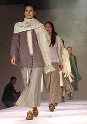 九月二十三日晚,香港時裝設計師吳美儀以簡約大氣,洋溢陸歐風情的時裝作品在2004青島國際時裝周上亮相。作者:史利