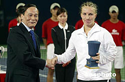九月二十六日晚,中國網(wǎng)球公開賽女子單打決賽在北京網(wǎng)球中心中央球場進(jìn)行,美網(wǎng)新后、俄羅斯名將庫茲涅佐娃一比二不敵賽會頭號種子選手、美國網(wǎng)壇名將小威廉姆斯,屈居亞軍。圖為比賽結(jié)束后北京市長王岐山(左)為庫茲涅佐娃頒發(fā)亞軍獎(jiǎng)杯。中新社記者:盛佳鵬
