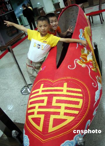 | 江蘇鎮(zhèn)江市的兩名兒童與一只世界最大的繡花鞋合影。據(jù)介紹,這只在當(dāng)?shù)厣虡I(yè)城展出的繡花鞋全長(zhǎng)2.8米,寬0.87米,高0.71米,重達(dá)63公斤,鞋內(nèi)可躺臥兩至三人,是由溫州7名著名手工藝專家用半年多時(shí)間精心制作而成,共耗去1公斤多真絲彩線,五匹布,及100多公斤有關(guān)材料。鞋面繡有大大的雙喜字、兩側(cè)繡有龍鳳圖案,繡面光亮,紋理分明,色彩鮮艷。作者:陳崗